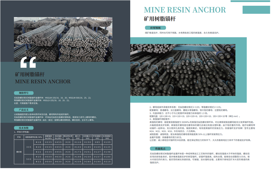 规格型号:无纵助螺纹钢式树脂锚杆金属杆体:MSGLW-335/16、18、20;MSGLW-500/18、20、22;等强螺纹钢式树脂锚杆金属杆体:MSGLD-335/16、18、20、22。