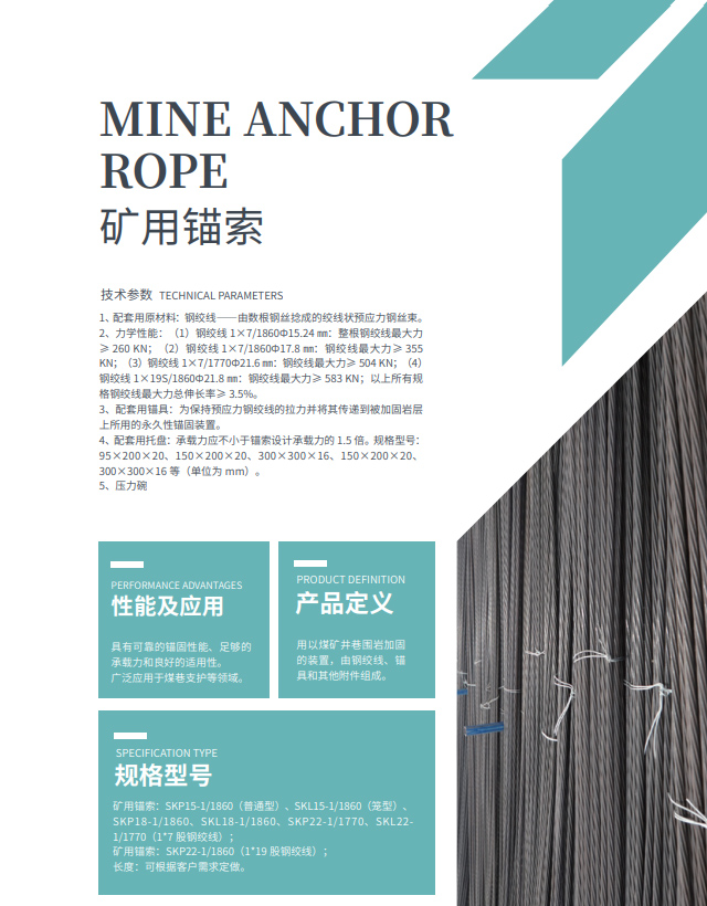 本公司供应矿用支护材料锚索,长度2-12m可定制广泛应用于煤巷支护等领域,具有可靠的锚固性能,足够的承载力和良好的实用性。质量有保证,欢迎咨询洽谈,价格面议。型号不同,价格不同,可提前电话咨询。